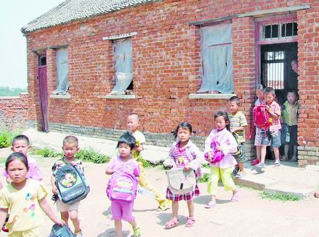 “學校只有一棟兩層只能容納8個班的教學樓,學前班和一至六年級占去7個教室,多媒體遠程教 室和辦公室合占一個教室。幼兒班的34個孩子沒處上課,晴天就在 3間破瓦房里湊合,雨天就停課!标惡S窭蠋熣f。幼兒班上課的3間破瓦房,房頂明顯下陷,破舊的教室門上橫七豎八地釘著幾個木板擋住窟窿,窗戶上已經(jīng)沒有玻璃,墻體上多處有明顯裂縫!昂⒆釉诶锩嫔险n太嚇人了!痹谠撔iT口,前來接孫子的73歲老人李繼剛說,“房子是上世紀70年代末蓋的,娃子在里面上課,家長天天擔心!