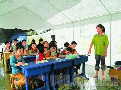 一位村民特意將學(xué)校的情況拍下來發(fā)到網(wǎng)上,吁請(qǐng)社會(huì)各界關(guān)心和支助。陸續(xù)有人送來書包、課本、文具、小黑板和課外讀物。什邡圣修堂的教職人員,幫他們聯(lián)系到志愿者前來任教,附近抗災(zāi)的部隊(duì)官兵為學(xué)校搭建起一頂新帳篷。