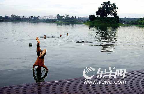 一位剛從水里鉆出來的學(xué)生證實(shí)了上述推斷:“不少市民傍晚會(huì)專門開車來這里游泳,周末岸邊都停滿了外面來的小車!彼f,學(xué)校的游泳池開放時(shí)間有限制,而且要收費(fèi),自認(rèn)為“水性好”的同學(xué)都樂意到中心湖游泳,“只要不下雨,這里的‘人氣’都很旺”。