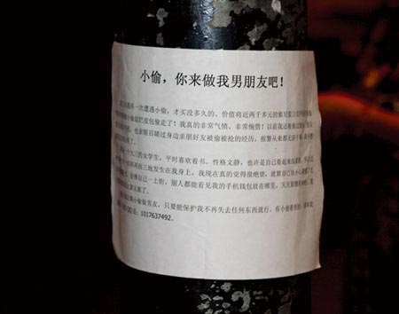 7月14日晚,南寧市朝陽廣場出現了兩張離奇的“征男友”小廣告,小廣告竟公然宣稱“小偷,你來做我男朋友吧”。在張貼小廣告之前,該女子曾在南國早報網論壇發(fā)帖,公布了她的這一想法,記者也曾與該女孩聯(lián)系,了解她此舉的原因。