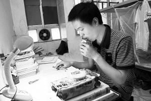 他租住在華師旁,15平方的房間200元一個(gè)月,除了衛(wèi)生間,被一張高低床和一張書桌擠的滿滿當(dāng)當(dāng)。書桌上攤放著一本物理參考書,旁邊還堆著厚厚一摞課本和各種復(fù)習(xí)資料,桌上還有《古文觀止》、《道德經(jīng)》等讀物。