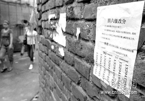 昨日上午,記者接到武昌某大學(xué)學(xué)生的投訴,稱又有人在學(xué)校附近張貼了“四六級(jí)改分”的廣告單。記者前往采訪見(jiàn)到,廣告標(biāo)稱可“解除你找工作、升學(xué)的后顧之憂”,并留下了聯(lián)系電話和QQ號(hào)碼,不時(shí)引來(lái)學(xué)生觀看(如圖)。