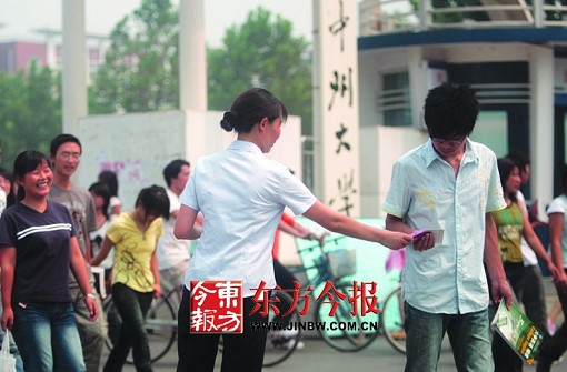 上午11時(shí),發(fā)放點(diǎn)移到中州大學(xué)和鄭州師專門口,正在報(bào)名的學(xué)生和家長明顯增多,看到計(jì)生人員發(fā)宣傳資料,很多學(xué)生主動(dòng)圍了上來。