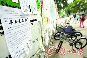 記者在中大校園內(nèi)學(xué)五飯?zhí)玫墓鏅谏,貼滿各種各樣的“求租”、“出租”廣告,在該學(xué)校附近城中村和小區(qū)街道的墻上則也隨處可見“臨時(shí)房屋出租”的廣告,沿主要街道兩側(cè),幾乎每個(gè)店鋪門前都立有醒目的臨時(shí)房屋出租廣告牌。