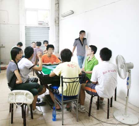 “里面賭得很大,一把牌最多可以輸200元!痹撏瑢W(xué)說(shuō),小文(化名)以前在附近一家書(shū)店里賭博,今年開(kāi)始逃課來(lái)這個(gè)地方賭。如果打通宵,第二天上午就不上課,在寢室睡覺(jué)!叭ツ昙依锝o的學(xué)費(fèi)都輸了,向家里要的買(mǎi)電腦的錢(qián)也輸了,輸了近萬(wàn)元。他家里的經(jīng)濟(jì)條件并不太好,讓人看著痛心!