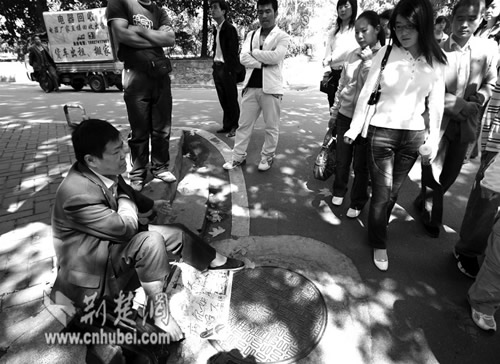 昨日上午10時許,記者趕到華中師范大學,在距離東門不遠的一處路口,一名男子在地上擺著一張報紙,上面用黑筆寫著:“××學院的×××,養(yǎng)父生病,你如此狠心,不管不問……”,吸引了許多學生圍觀(如圖)。
