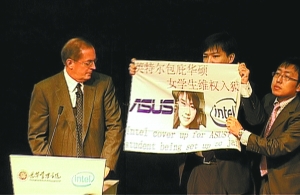 昨日(10月29日,下同),英特爾(Intel)總裁兼CEO歐德寧在北大演講時,華碩天價索賠案主角之一周成宇忽然沖上臺,舉牌抗議英特爾與華碩聯(lián)合陷害黃靜,隨后被保安架離會場。周成宇事后稱,此舉是“為黃靜討個公道”。