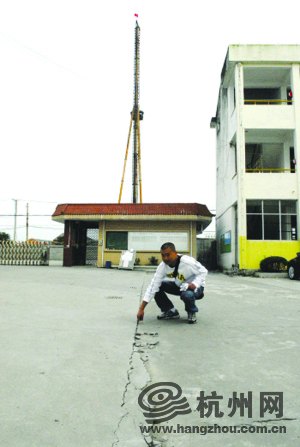學(xué)校地面開裂,不遠(yuǎn)處就是打樁機(jī)。 攝影 曉春