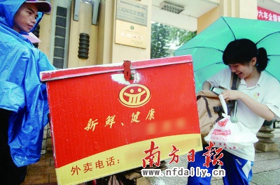 記者以想訂外賣(mài)的學(xué)生身份,向西校區(qū)保安員咨詢。該保安員明確告訴記者,他們自上周起接到上面“外賣(mài)不得入內(nèi)”的口頭通知,理由是外賣(mài)大多由一次性白色塑料飯盒裝盛,這類(lèi)飯盒污染大、不環(huán)保!叭绻麑W(xué)生叫了這樣的外賣(mài),就只能在校外吃完或者直接到外面餐館就餐!痹摫0舱f(shuō)。當(dāng)記者問(wèn)到如果外賣(mài)由鋁盒、砂鍋等其他材質(zhì)器具裝盛是否可以入校,該保安考慮了一下表示“可以”,“以前叫外賣(mài)的學(xué)生還比較多,現(xiàn)在明顯少了!
