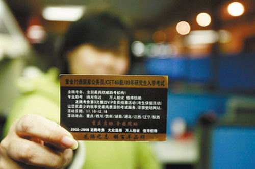 記者隨即按照卡片上的網(wǎng)站登錄,發(fā)現(xiàn)網(wǎng)站上的業(yè)務(wù)范圍涉及了多類(lèi)考試,包括大學(xué)英語(yǔ)、司法考試、注冊(cè)會(huì)計(jì)師考試等。