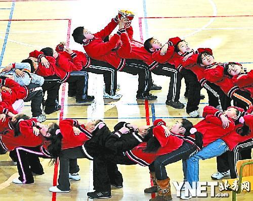 不用任何支撐,20名學(xué)生依次躺在同伴腿上疊成一個圈,雙手傳遞裝著乒乓球的小桶,6分鐘內(nèi)比賽哪個隊(duì)傳遞得最快。這是“歡樂不倒翁”項(xiàng)目比賽時的場景,不僅比拼個人的平衡能力,還要求孩子和前后兩個伙伴都默契配合。