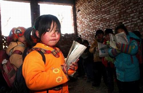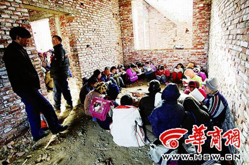 上午10時(shí)許,距董廟小學(xué)200米的地方傳來讀書聲。這是剛砌好不久的磚房,沒窗也沒門,學(xué)生分別待在幾個(gè)房間里,四下漏風(fēng),穿棉襖還是冷,大家圍成圈不停地跺著腳。老師用磚搭個(gè)簡易爐,燒些樹枝讓大家能感覺點(diǎn)暖意!斑@種地方的確不能上課,總不能耽誤學(xué)業(yè),只好先找個(gè)地方解決了!崩蠋熣f。