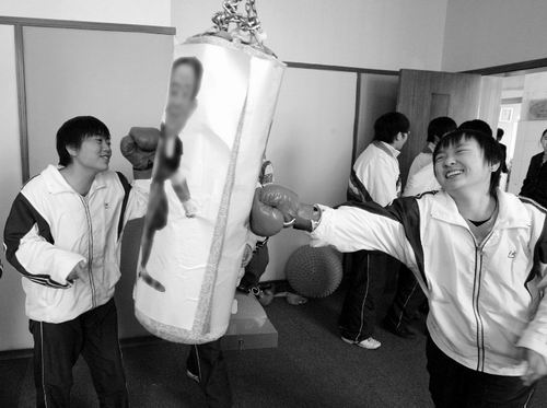 25日,記者走進(jìn)陽(yáng)光心靈驛站,黃色和藍(lán)色相間的墻面讓這個(gè)房間顯得格調(diào)平和而優(yōu)雅。驛站由陽(yáng)光工作室、心理宣泄室、心理放松室三部分組成。站內(nèi)還提供了諸如宣泄皮人、臉譜、放松球、沙袋及拳擊手套等宣泄工具,配備專業(yè)教師7名。記者注意到,該校分管學(xué)生的副校長(zhǎng)孟凡祥和3位級(jí)部主任的頭像也上了沙袋,學(xué)生們打起來(lái)毫不手軟。