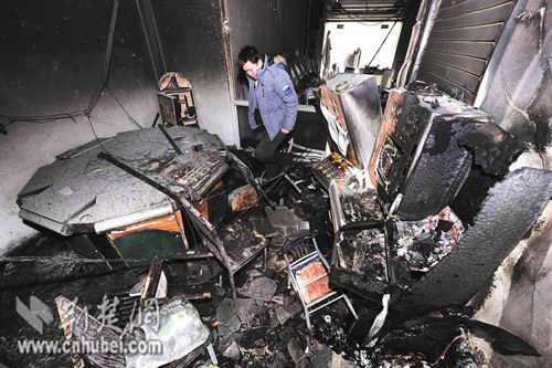 該學(xué)生公寓位于武漢經(jīng)濟(jì)技術(shù)開發(fā)區(qū)碧湖新村。昨日上午9時,記者在該公寓42棟宿舍看到,該棟宿舍共有6層,其中1樓為臨街門面。失火的游戲機(jī)室位于3單元201宿舍樓下,面積約50平方米,里面有10多臺游戲機(jī),均被燒毀(如圖)。