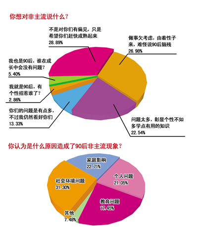昨日上午,在“90后非主流現(xiàn)象”多項(xiàng)調(diào)查中,對(duì)于90后非主流現(xiàn)象的形成,有60%的網(wǎng)友認(rèn)為主要是受社會(huì)和家庭影響。
