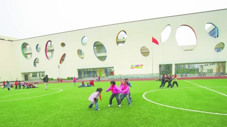 昨日下午,記者來到草堂小學(xué)翠微校區(qū),4棟通過走廊連為一體的4~5層的建筑格外引人注目。正對(duì)學(xué)校大門的墻體,鑲著10多個(gè)彩色的橢圓。設(shè)計(jì)者、西南交通大學(xué)教授王蔚介紹說,翠微校區(qū)占地20余畝,建筑面積一萬余平方米,而總投資僅 2000多萬元!斑@些彩色的橢圓圖案,代表著水滴。陽光下,‘水滴’呈現(xiàn)出不同顏色,這代表了學(xué)生們的不同個(gè)性。校舍以‘陽光下的水滴’為設(shè)計(jì)構(gòu)思,充分表達(dá)了在我國(guó)素質(zhì)教育的原則下,尊重個(gè)性發(fā)展,尊重少年兒童人格特征的理念!
