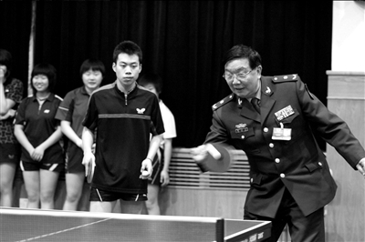 全國(guó)政協(xié)委員田伏洲對(duì)學(xué)生們說(shuō):“我們國(guó)家一直沒(méi)能獲得諾貝爾獎(jiǎng),曾經(jīng)陳景潤(rùn)很有希望獲得,但他英年早逝讓我們扼腕,大家一定要養(yǎng)成體育鍛煉的好習(xí)慣,只有健康的身體才能更好地為國(guó)家服務(wù)!绷私獾狡古仪蚴潜本66中的特色體育運(yùn)動(dòng)項(xiàng)目,四位委員還參觀了學(xué)生們的乒乓球訓(xùn)練場(chǎng)。在學(xué)生們的邀請(qǐng)下,年過(guò)花甲的兩位將軍和兩位教授也拿起了乒乓球拍,與同學(xué)們對(duì)壘了一局乒乓球雙打。