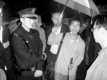 “下午2點20分左右,距比賽開始僅僅剩下40分鐘了,賽場內(nèi)前奏的音樂已經(jīng)響起,這時‘米黃外套’回來終于告訴大家,由于此次用的是賽車場發(fā)給上海市中學(xué)生的團(tuán)體票,大學(xué)生不能入場,所以今天可能‘沒戲了’。此時九陽旅行社的洪經(jīng)理看起來也焦頭爛額,他沒有打傘,站在大雨里,水珠不斷順著頭發(fā)流下!