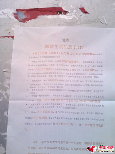 前日,位于成都清水河附近的一所高校教學(xué)樓前,張貼出一張醒目的告示,上面寫著“齷齪男們注意了”。告示上說(shuō),在本月21日傍晚6點(diǎn)55分左右,這位女學(xué)生在2號(hào)實(shí)驗(yàn)樓與幾個(gè)男生一起乘電梯,被他們?cè)陔娞堇飸蚺謿鈶,她記下了幾個(gè)男生的臉和他們上課的教室。她要求幾個(gè)男生在本周內(nèi)寫道歉信,且要貼在該告示的旁邊。