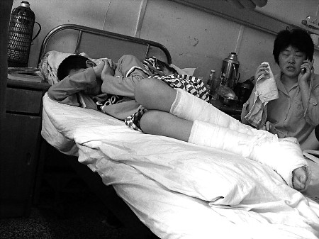 5月7日上午11點,記者在山東省中醫(yī)藥大學附屬醫(yī)院病房樓202病房見到了雙腿打著石膏的小峰和他的母親莊女士。