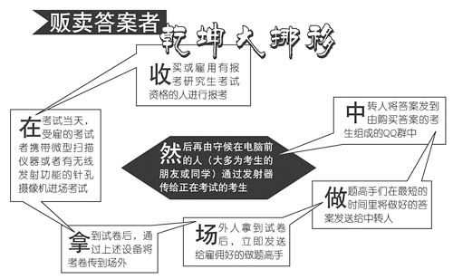 首先,雇用有報(bào)考研究生考試資格的人進(jìn)行報(bào)考,在考試當(dāng)天,受雇者攜帶微型掃描儀器或有無線發(fā)射功能的針孔攝像機(jī)進(jìn)入考場(chǎng)考試,拿到試卷后,通過上述設(shè)備將考卷傳到場(chǎng)外,場(chǎng)外人拿到試卷后,立即發(fā)送給雇用好的做題高手,做題高手在最短的時(shí)間里將做好的答案發(fā)送給中轉(zhuǎn)人,中轉(zhuǎn)人再將答案發(fā)到由購買答案的考生組成的QQ群中,然后再由守候在電腦前的人(大多為考生的朋友或同學(xué))通過發(fā)射器傳給正在考試的考生。