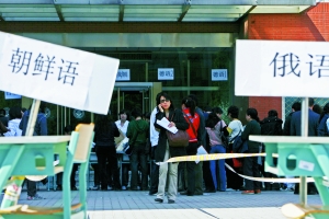 二外今年8個(gè)小語(yǔ)種專業(yè)計(jì)劃招收102人,昨日?qǐng)?bào)名現(xiàn)場(chǎng)吸引來2300余名家長(zhǎng)和學(xué)生,F(xiàn)場(chǎng),一位家長(zhǎng)拿著計(jì)算器核算一番后,決定替孩子報(bào)考朝鮮語(yǔ),“這個(gè)專業(yè)報(bào)考的人少,分?jǐn)?shù)自然不會(huì)太高!