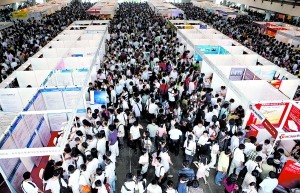 奧運(yùn)會(huì)后首場(chǎng)名為“共創(chuàng)未來(lái)”的大型綜合招聘會(huì)昨天開(kāi)場(chǎng),摩肩擦踵、人頭攢動(dòng)的景象再度上演。此次招聘會(huì)將持續(xù)到今天下午4時(shí),雖然有600多家用人單位參展提供了5000余個(gè)職位,但據(jù)主辦方預(yù)計(jì),兩天時(shí)間將至少吸引近10萬(wàn)名求職者前來(lái)應(yīng)聘。