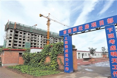 9月21日上午,記者驅車趕往太平村原址。在順義區(qū)北二環(huán)路南側,記者看到,十余棟高樓已經拔地而起,外部的墻體結構均已經建設完畢,但尚未粉刷。在工地的入口處,清晰地寫著“回遷房”等字樣。據(jù)工人們稱,工程是從年后開始的,曾經在4月前后停了一段時間,后來又開始復工。