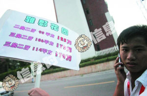 中介小黃告訴記者,最近來(lái)看樓的人少了,所以主管要求大家每天輪班在附近的主要街道上叫賣(mài),吸引人氣。而且,諸如下午五六點(diǎn)的下班時(shí)間、周六周日等人流較多的時(shí)候,他們還要分成幾組上街。在叫賣(mài)的過(guò)程中,他碰到過(guò)一兩個(gè)有意的客戶(hù),不過(guò)他也只是派了名片,拿到了對(duì)方的電話(huà),目前還沒(méi)什么實(shí)際進(jìn)展。“現(xiàn)在客戶(hù)觀(guān)望的多。”小黃說(shuō),不少客戶(hù)都以“樓價(jià)肯定會(huì)降點(diǎn)”為由拒絕看樓,打算過(guò)一陣子再考慮。 昨日在海珠區(qū)新港東路上,記者在一個(gè)路口看到三個(gè)西裝革履的地產(chǎn)中介高舉筍盤(pán)信息牌,凡有車(chē)輛路過(guò),就用力揮牌力求引起車(chē)主注意。其中一位中介告訴記者,他們的中介行是最近在附近開(kāi)業(yè)的,而附近只有一個(gè)大型樓盤(pán),“周邊三家中介行,全是靠它吃飯啊。”據(jù)悉,此前該樓盤(pán)的二手成交相當(dāng)活躍,“現(xiàn)在盤(pán)源比較緊張”,這位中介說(shuō),一些原本打算賣(mài)房換新大屋的業(yè)主擔(dān)心貸款成本增加,變得很猶豫,令中介行的盤(pán)源變得吃緊。