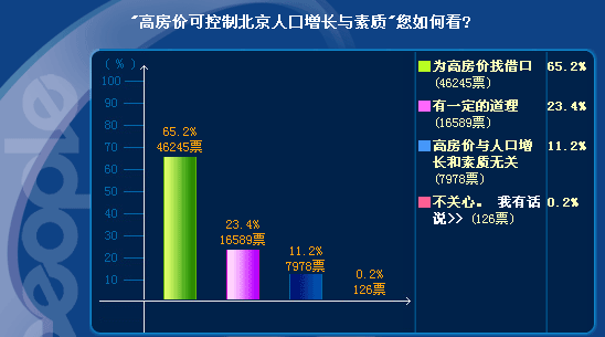 截止到14日晚21時,參與調(diào)查的網(wǎng)民共計70938人,其中有46245人認為這是在為高房價找借口,直接質(zhì)疑任志強的“素質(zhì)”,持此一觀點的網(wǎng)民占總?cè)藬?shù)的比例高達65.2%。此外另有11.2%的人也明確表示房價與人口增長和素質(zhì)無關(guān)。不過,也有近四分之一的網(wǎng)民認為任志強的說法"有一定道理"。