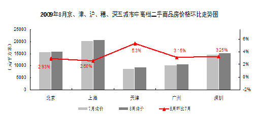 從圖表中的數(shù)據(jù)可以看出,2009年8月京、津、滬、穗、深五大城市的中高檔二手房價格均呈上漲走勢。在上述五大城市中,8月份中高檔二手房上海和北京分別上漲2.58%和2.93%?傮w來看,2009年8月五大城市中高檔二手商品房在市場成交活躍的促進(jìn)作用下,價格再創(chuàng)新高。價格上漲最明顯的依然是天津,上漲了5.3%。其次是深圳和廣州,分別上漲3.25%和3.15%。