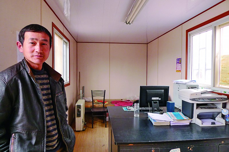 “你看到的只是外面,里面更好!痹摴さ匾晃恍振T的負責人自豪地說。果然如馮先生所言,房間內(nèi)部別有洞天。四周墻壁不但加裝了保溫層,還進行了裝飾。上有吊頂?shù)鯚簦落亸?fù)合木地板,窗戶上包了窗套,墻上安了插座和電箱,空氣開關(guān)的電閘有模有樣,桌上還放著電腦和打印機等辦公設(shè)備!霸趺礃樱窟不錯吧?在工地上住這樣的房子算是一種奢侈了。這些電源插座都不是擺設(shè),用暖氣和空調(diào)都沒問題!瘪T先生介紹說。