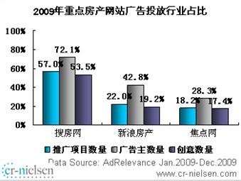 尼爾森《2009中國房地產(chǎn)網(wǎng)絡(luò)廣告市場研究項目報告》顯示,2009年中國互聯(lián)網(wǎng)房地產(chǎn)行業(yè)展示類廣告推廣項目總量為14987,廣告主總量為2254,創(chuàng)意總量為36193,三項指標(biāo)中搜房網(wǎng)分別占據(jù)了行業(yè)整體的57%、72%、53.5%。報告分析指出,房地產(chǎn)網(wǎng)絡(luò)展示廣告投放TOP3網(wǎng)站分別為搜房網(wǎng)、新浪房產(chǎn)和焦點網(wǎng),除搜房網(wǎng)以較大優(yōu)勢領(lǐng)先外,新浪房產(chǎn)與焦點網(wǎng)的展示廣告投放水平競爭膠著,新浪房產(chǎn)覆蓋房產(chǎn)行業(yè)42.8%的廣告主,焦點網(wǎng)約占三成,兩家網(wǎng)站房地產(chǎn)展示推廣項目數(shù)與創(chuàng)意數(shù)水平基本相當(dāng)。
