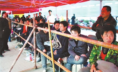 記者詢問幾位排隊(duì)的農(nóng)民工:“你們排隊(duì)拿號是自己買房嗎?”他們說,是受買房人之托排隊(duì)拿號的。排隊(duì)—天—夜可以拿到300元的辛苦費(fèi)。由于要熬—通宵,所以都穿上了厚厚的夾衣。( 記者梁超)
