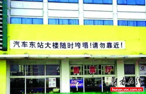 該工作人員表示,車站邀請專家對大樓進行鑒定指出,此樓隨時會垮塌,有可能發(fā)生脆性斷裂,人員在里面非常危險,所有的辦公單位已經搬出!按虺鰴M幅是為了提醒廣大市民‘此樓危險’!