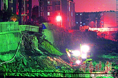 晚8點(diǎn)左右,記者趕到泉景天沅·秀園新建樓盤施工現(xiàn)場(chǎng),這處工地南側(cè)緊挨著王女士居住的樓房。地基已經(jīng)挖到十幾米深,如刀切斧剁一般齊刷刷到底,橫截面上有一些用來加固土層防止坍塌的錨桿。根據(jù)記者目測(cè),坍塌的地方長(zhǎng)度約10米,土層從上到下一落到底(上圖)。為防止情況繼續(xù)惡化,施工方已經(jīng)采取了措施。兩輛渣土車正從挖出的土堆上往坍塌的地基處運(yùn)送土方,而兩臺(tái)挖掘機(jī)則把運(yùn)來的土方往坍塌處回填反壓。