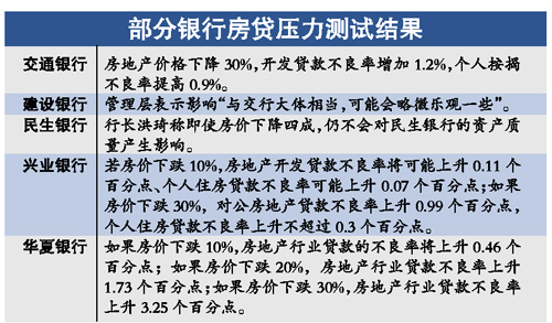 某家股份制銀行高層對記者表示,雖然在輕度和中度壓力環(huán)境下,銀行風(fēng)險(xiǎn)質(zhì)量得到了很好的控制,但是壓力測試結(jié)果顯示,在房價下調(diào)30%、基準(zhǔn)利率上浮108個基點(diǎn)的重度環(huán)境下,商業(yè)銀行的房地產(chǎn)貸款不良率會出現(xiàn)較大幅度躍升。