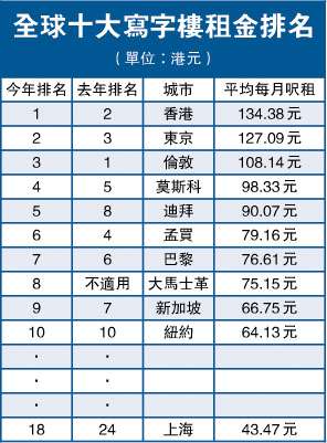 報(bào)告顯示,香港核心區(qū)域?qū)懽謽瞧骄咦鉃?34.38港元。另外,報(bào)告還顯示,上海以43.47港元的尺租排名第十八位。