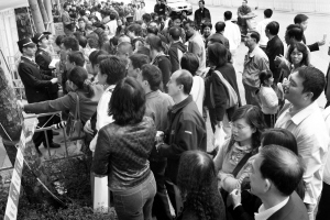 記者在銷售部看到,現(xiàn)場電子屏幕顯示,156套房子在不到兩個小時的時間已全部售光。但是仍然有很多的購樓者等在銷售大廳門外,希望能夠有一些購樓者放棄自己已購買的單位。
