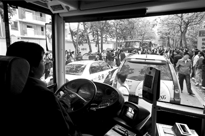 記者發(fā)現(xiàn),現(xiàn)場(chǎng)有9輛31路公交車被堵無(wú)法前行,公交司機(jī)們?nèi)齼蓛傻鼐墼诼愤吜奶。一名王姓司機(jī)說(shuō),他已被堵近1小時(shí),但因車隊(duì)未允許調(diào)頭返隊(duì),他只好原地等待。當(dāng)被問(wèn)及如何處理車上乘客時(shí),他說(shuō),由于等待時(shí)間過(guò)長(zhǎng),乘客只能下車步行離開(kāi)此地。