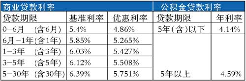 目前,中國(guó)人民銀行規(guī)定的金融機(jī)構(gòu)一年期貸款基準(zhǔn)利率為5.85%。同時(shí)允許商業(yè)銀行在基準(zhǔn)利率的基礎(chǔ)上最多向下浮動(dòng)10%。而建設(shè)部規(guī)定的個(gè)人住房公積金貸款利率為:5年(含)以下年利率4.14%;5年以上貸款年利率4.59%。(見(jiàn)下表)