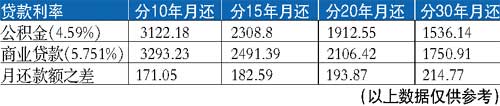 以貸款30萬(wàn)元為例,采取等額本息還款法,采用公積金貸款和商業(yè)貸款,其月還款額對(duì)比為:(單位:元)