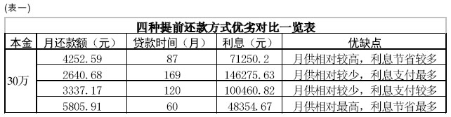 方式一,部分提前還款,剩余的貸款保持每月還款額不變,將還款期限縮短。如此算來,30萬元貸款需照舊每月還款4252.59元,需要大概七年零三個(gè)月左右的時(shí)間。利息共計(jì)71250.20元。