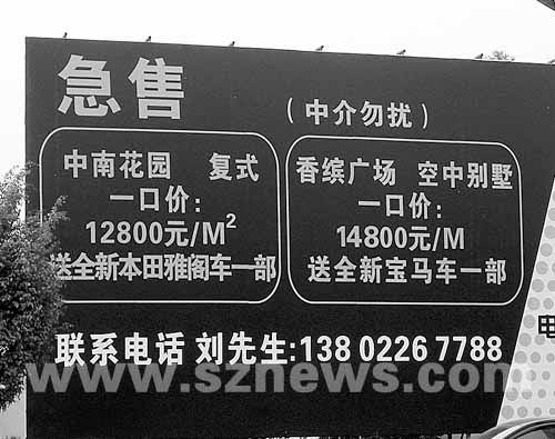 最大的一塊廣告牌矗立在白石路與科苑南路交匯處的西南側(cè),約10平方米大小,黑白分明的底色,端端正正的橙色粗體字格外引人注目!凹笔邸弊謽酉掠袃蓚(gè)橢圓形框,框內(nèi)寫(xiě)明了具體出售內(nèi)容,一個(gè)是“中南花園,復(fù)式,一口價(jià):12800元/平方米,送全新本田雅閣車(chē)一輛”,另一個(gè)是“香繽廣場(chǎng),空中花園,一口價(jià):14800元/平方米,送全新寶馬車(chē)一部”。廣告牌下端還留下了業(yè)主劉先生的手機(jī)號(hào)碼,并特別注明“中介勿擾”。