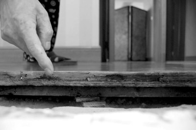 “距我們反映主衛(wèi)門框下面滲水、造成主臥的地板部分褪色、門框底框腐爛、門套底部貼面有氣泡突起、地磚大面積發(fā)黃這些問(wèn)題已經(jīng)一個(gè)月了。有人來(lái)看過(guò)也說(shuō)是‘防水沒(méi)做好’,但沒(méi)單位負(fù)起這個(gè)責(zé),徹底解決這件事,只是互相推諉。作為弱勢(shì)群體的我們只能不停地反映、等待,F(xiàn)在被挖開(kāi)的地方,每天都會(huì)有小蟲爬出來(lái)。哎,花600多萬(wàn)買的房子,浴缸卻只能看不能用。 ”陳老先生的老伴邊說(shuō)邊指著旁邊畚箕里她掃出來(lái)的黑色小蟲子。對(duì)此,物業(yè)部門也派人檢查了好幾次。