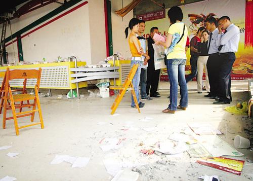 從當(dāng)日上午10時(shí)至下午2時(shí),不少業(yè)主聚集在售樓部?jī)?nèi),要求開(kāi)發(fā)商給個(gè)明確答復(fù),一直未能如愿。一些業(yè)主撕碎了文件,甚至把售樓部的椅子扔到門外。為此,轄區(qū)民警曾兩度趕到現(xiàn)場(chǎng)維持秩序。