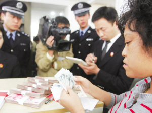 兩名法警立即沖上去,與女子爭奪在一起。最終,女子被帶走,信封被搶了回來,法官從信封里倒出數(shù)十個建行存折和數(shù)十張銀行卡,并找到一張記錄該公司12個銀行賬戶的單子,“戰(zhàn)果不錯。 眻(zhí)行法官笑了。