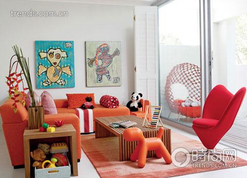 紅色跟橘色作為主調(diào)并不是很容易把握的,因為大面積此類顏色的使用容易使人感到煩躁,而這間客廳的搭配卻恰到好處。墻壁摒棄了花色的壁紙,保留純白的底色,只掛了兩幅充滿稚拙童趣的畫作,并以簡潔明快的天藍色打破視野中紅色占據(jù)的僵局。地板也做了簡單處理,只鋪一塊淺淡的扎染效果的地毯,絕不喧賓奪主。
