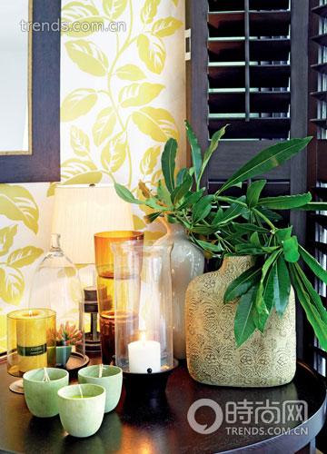 整幅畫面中最為濃重的一筆當(dāng)屬貼近窗邊的角落,一樣是深色圓茶幾,上面擺放的花瓶十分古樸,插花也顯得更為隨性和張揚(yáng)。蠟燭不再是單一的白色,茶綠色的三杯小蠟自成一體,身后還藏著黃色的蠟燭與玻璃器皿。