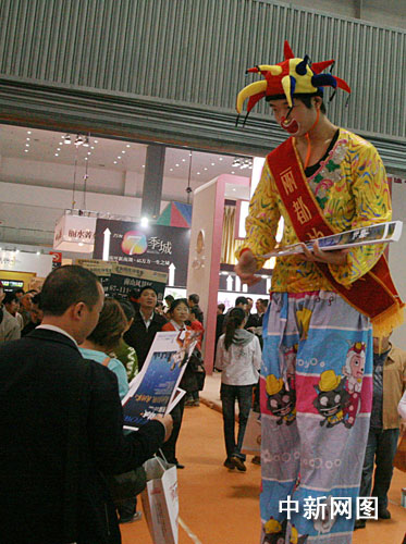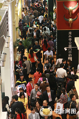 在房交會現(xiàn)場,房地產(chǎn)開發(fā)商們?yōu)槲搜矍颍贡M渾身解數(shù)攬客。禮儀小姐舉著牌子,打著樓盤的廣告語,滿場游行;馬戲團小丑、美女模特站在展臺門口派發(fā)傳單;衣著印有樓盤信息T恤衫的促銷人員,四處游說和宣傳,為自己的展臺吸引人氣……